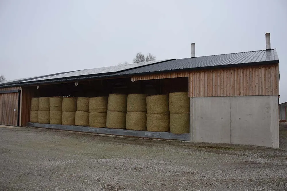 Réalisés par des entreprises du territoire – « Nous y tenions ! » –, les travaux de construction ont été achevés en octobre 2020. Depuis, Jean-Marie a eu le temps de prendre son nouvel outil en main. L’équipement permet de sécher simultanément 40 balles rondes. Celles-ci sont placées sur des bouches de séchage intégrées dans la dalle et via lesquelles de l’air réchauffé par le toit solaire ou par les chaudières – en fonction de la température ambiante – est pulsé. « Je fais 5 coupes d’herbe par an, alternées de 4 à 6 semaines. Il faut ensuite de 36 à 48 heures pour passer d’une balle de 500 kg bruts à 380 kg de foin sec. Mais il y a une méthode de travail des balles à respecter, le Segrafo m’a d’ailleurs beaucoup apporté sur cet aspect ». L’éleveur ne tarit pas d’éloges sur le foin ainsi obtenu. « Il n’y a pas de refus. Je trouve que les animaux sont plus calmes et que leur viande est bien persillée ».