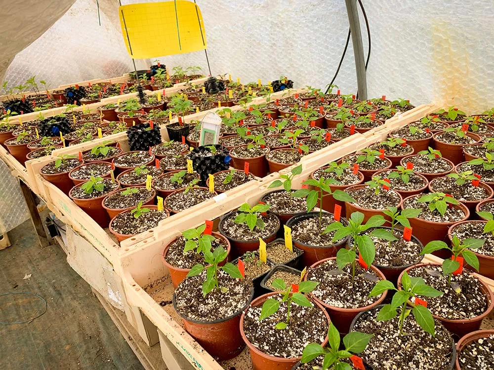 Sur ses 8,5 ha, le Gaec cultive pas moins de 100 espèces et plus de 400 variétés. On y trouve des légumes de plein champ, des fruits ou des plantes aromatiques. Mais la particularité des deux maraîchers, c’est de proposer à leurs clients des produits atypiques avec un goût prononcé. « J’adore les plantes exotiques », annonce Thomas Jagu. « Ce qui me motive dans mon métier, c’est de découvrir de nouvelles espèces, de trouver des légumes et fruits originaux que je pourrai cultiver ici, en Bretagne ». L’exploitation abrite des citronniers, des orangers, des kumquats ou encore des pomelos. Tout est cultivé en serre froide. Le couple a en effet sélectionné des variétés qui supportent jusqu’à -10 °C. Pour ajouter encore plus de rusticité, Thomas a utilisé un citronnier épineux (Poncirus trifoliata) comme porte-greffe sur tous les agrumes. « Cela permet notamment d’augmenter la résistance au froid des greffons », explique le maraîcher. À l’heure actuelle, ces arbres ne produisent que quelques dizaines de kilos de fruits par an. « Notre serre d’agrumes n’est pas rentable », concède le couple. « Mais c’est un produit d’appel pour nos clients. C’est notre signature ». En extérieur, à côté des kiwis, les exploitants ont planté des asiminiers trilobés que Thomas a directement fait venir de l’Oregon en 2015. Les fruits que donne cet arbre ont un goût qui rappelle la banane et la mangue, avec une chair très crémeuse. « C’est excellent en sorbet », sourit l’agriculteur. Certaines espèces ont également un aspect sentimental et rappellent les origines espagnoles et d’Amérique du Sud de Lèna, ainsi que les années qu’elle a vécues à la Réunion. Le Gaec met enfin un point d’honneur à faire découvrir aux consommateurs des légumes anciens, à l’instar des ocas du pérou, de la poire de terre ou des capucines tubéreuses. « Nous voulons proposer beaucoup de diversité à nos clients pour ne pas les lasser », affirment les deux exploitants.