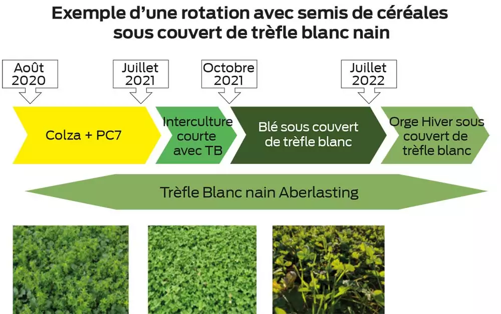 Le couvert de trèfle blanc peut être exploité entre la récolte de colza et l’implantation de la céréale. Bien maîtrisée, cette technique permet d’améliorer le rendement final ainsi que le taux de protéine de la céréale. Une des techniques les plus simples à développer est de semer le trèfle blanc nain avec un colza d’hiver et du trèfle d’Alexandrie. Le semis doit être réalisé au mois d’août afin de permettre dans un premier temps un bon développement du colza mais également une installation du trèfle blanc nain. Durant le cycle du colza, le trèfle blanc nain va rester « nanifié » au pied du colza. Il faut bien évidemment adapter le désherbage du colza pour conserver le trèfle blanc. Ensuite, après la récolte du colza, le trèfle ayant de la lumière va se développer et coloniser les chaumes. Le sol étant bien couvert, il y aura automatiquement moins de salissement en interculture.
