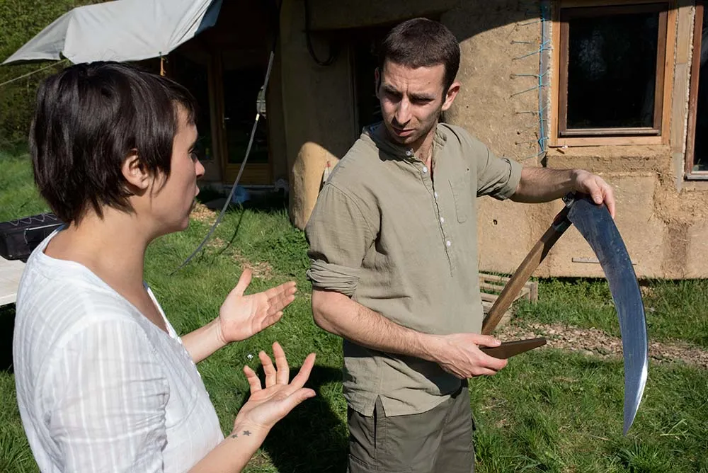 Une fois ces prérequis balayés, les apprenants sont lancés dans leur première fauche. Certains comme Paul aujourd’hui, comédien anglais propriétaire d’un domaine dans la Creuse, attrape presque instantanément le geste juste. « Au bruit, on entend comment ça coupe, comment la personne s’en sort… Peu à peu, on cherche un certain relâchement. » Au fur et à mesure que les élèves avancent, Delphine fait observer les différents types d’herbe – « Pour faucher une touffe de dactyle, il faut mettre un peu plus de force par exemple » – et leur apprend à suivre le profil du terrain quand il n’est pas plat. Mais aussi à faucher autour d’un arbre ou d’une bordure. « On débute en posant la lame contre l’obstacle pour éviter de l’abîmer. » C’est une lame qui n’aime pas les chocs et les surprises comme les pierres ou pire, les fils de fer.