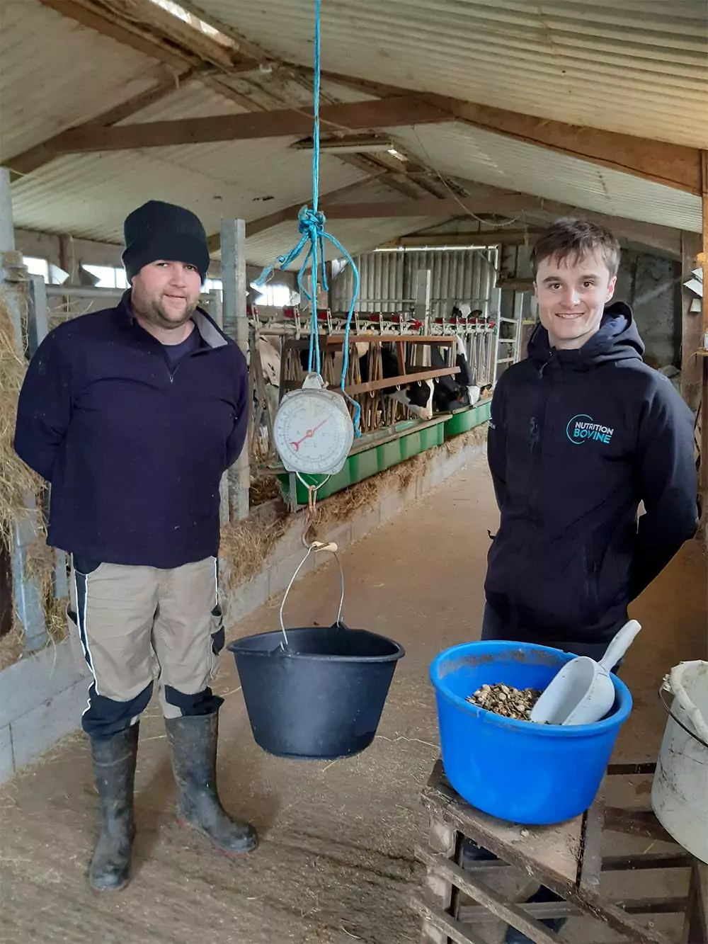 La coopérative propose d’accompagner les éleveurs pour optimiser l’élevage de leurs génisses. Théo Lecroc, alternant au service Nutrition bovine Eureden, s’est chargé d’effectuer les pesées des génisses de 0 à 6 mois et calculer ces GMQ à l’aide d’une cage de pesée, d’une toise et d’un rondo. Ce service proposé par Eureden limite l’investissement en matériel et en temps pour les éleveurs. Au Gaec de la Croix, les veaux sont tout de même pesés à la naissance, Théo Lecroc apprécie : « C’est un vrai point fort pour ensuite suivre la courbe de croissance en fonction des pesées. Comme cela, on peut ajuster la ration pour chaque génisse ». Dans l’élevage, la quantité d’aliment à distribuer par génisse est indiquée sur un tableau sur chaque case. « En faisant peser nos génisses, on a un regard extérieur et cela permet d’adapter le programme alimentaire si besoin », explique Gaëtan Rochefort. « À force de voir les résultats on apprend à mieux connaître les repères de croissance, à bien cibler les génisses et cela donne envie d’évoluer et de s’améliorer », commente l’éleveur. Un contrôle est également effectué sur les génisses de plus de 6 mois grâce à un parcours et un système de contention créé dans l’ancienne salle de traite avec des barrières et des pesons. « Ce système est sécurisé et je peux contrôler le poids, la taille, tout faire d’un coup sans perdre de temps, c’est aussi moins de stress pour l’animal », souligne l’agriculteur.