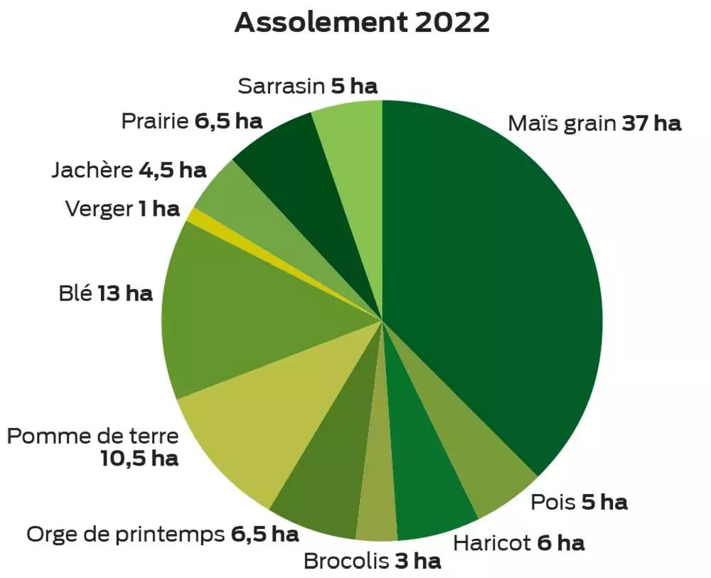 L’assolement, sur la centaine d’hectares de l’exploitation de Lintever, évolue progressivement depuis la décision, en 2019, de passer en bio, « par conviction », selon les termes de Nicolas Rafflé, qui travaille avec son épouse Claire et un salarié. La ferme, au parcellaire groupé, entièrement irrigable, compte trois ateliers : du plant de pomme de terre dont la surface passe de 20 à 10 hectares avec le passage à la bio ; des légumes industrie et des céréales (le blé deviendra dominant, au détriment du maïs grain). « Il y aura deux rotations types en système de croisière, en fonction de la qualité du sol : une sur les limons pour les ¾ de la surface et une autre sur les parties plus humides », indique l’agriculteur.