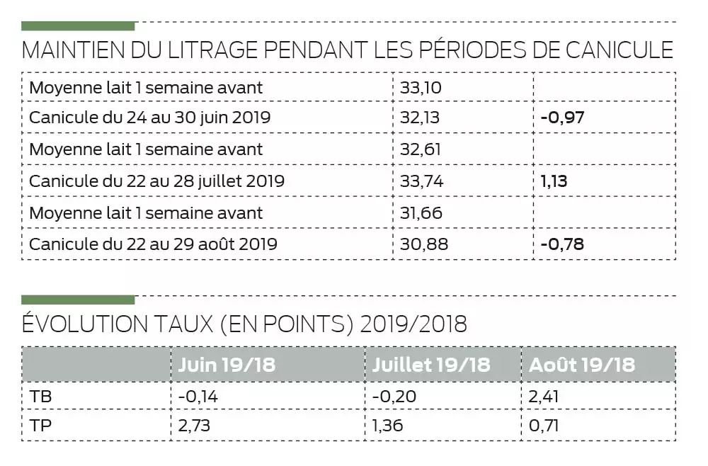 « En période de forte chaleur, je constatais une perte de 2 à 3 kg de lait et une baisse assez catastrophique au niveau des taux, jusqu’à 3 points de TP et TB », raconte l’éleveur. Alice Dejean, commerciale chez Deltavit, partenaire Eureden, lui a alors proposé d’essayer une solution nutritionnelle spécifique pour soutenir les animaux pendant les périodes de stress thermique. Pour les éleveurs, l’objectif était d’améliorer leur revenu car l’impact financier d’une canicule sur les taux et la production n’est pas négligeable. « Lorsque j’ai commencé à utiliser le nutritionnel Delta Axion Thermoplus, je me demandais comment le produit pourrait être efficace au vu de la petite quantité apportée (100 g/VL/jour) par rapport au volume total de la ration », commente-t-il. Après quelques jours de distribution, l’effet a été immédiat et très visuel. Il n’y a pas eu de problèmes d’appétence, il y a eu une amélioration de la quantité ingérée car il n’y avait plus de problème d’inconfort. « Je ne constate plus de baisse de la NEC et des taux ce qui m’a permis d’améliorer mes performances techniques et économiques », conclut l’éleveur. D’une année à l’autre l’EARL du Domaine des Salles a gagné jusqu’à 2,7 points de TP et n’a plus subi de baisse de plus d’un point de TB.