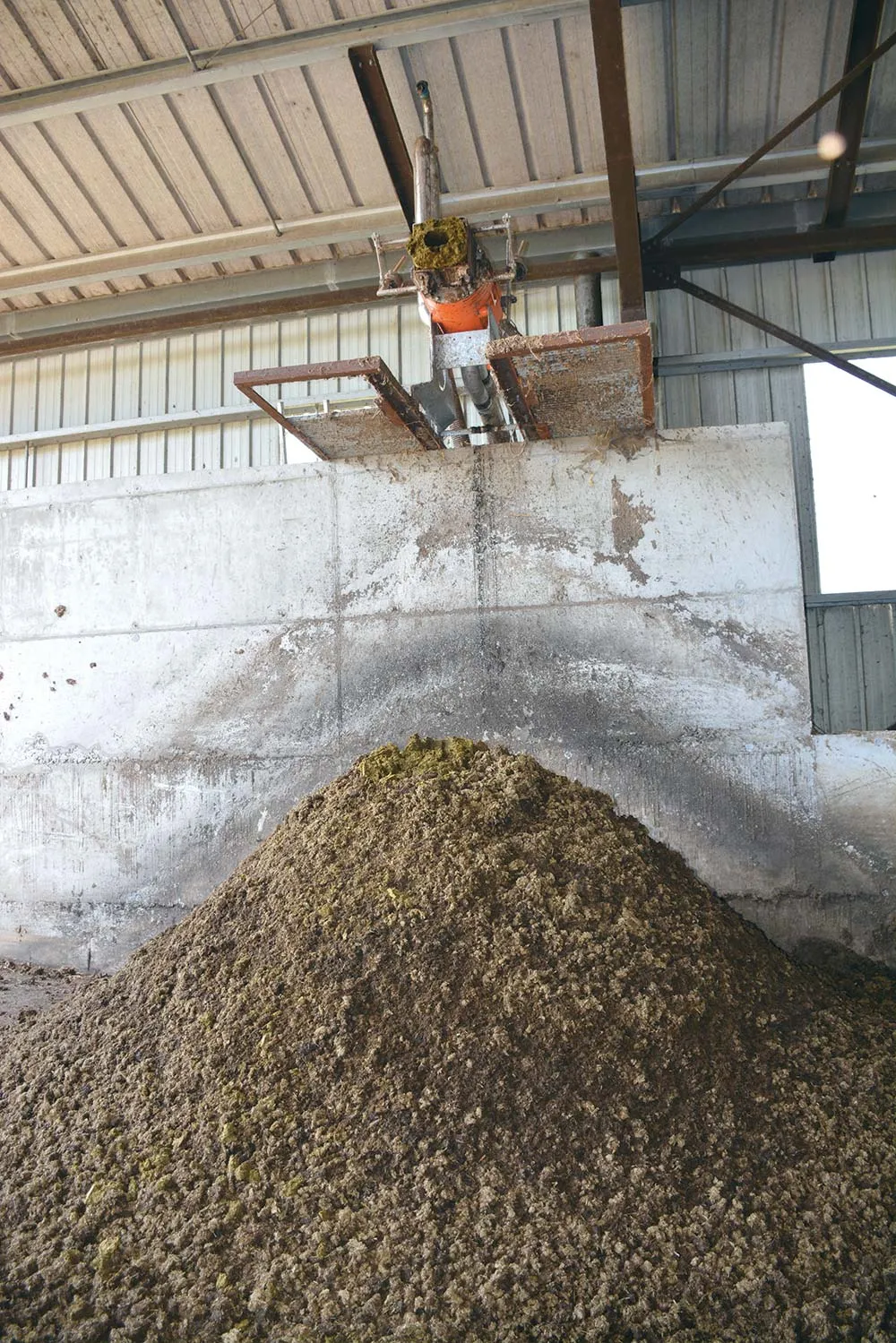 Selon la destination de la phase solide, le pressage est plus ou moins important. « La partie compostée affiche un taux de matière sèche d’environ 24 % et elle contient près de 4 unités N. Ce produit est placé dans la fumière où il monte en température, à plus de 60 °C. Le compost peut ensuite être facilement utilisé sur les prairies et épandu sans limite de voisinage. »