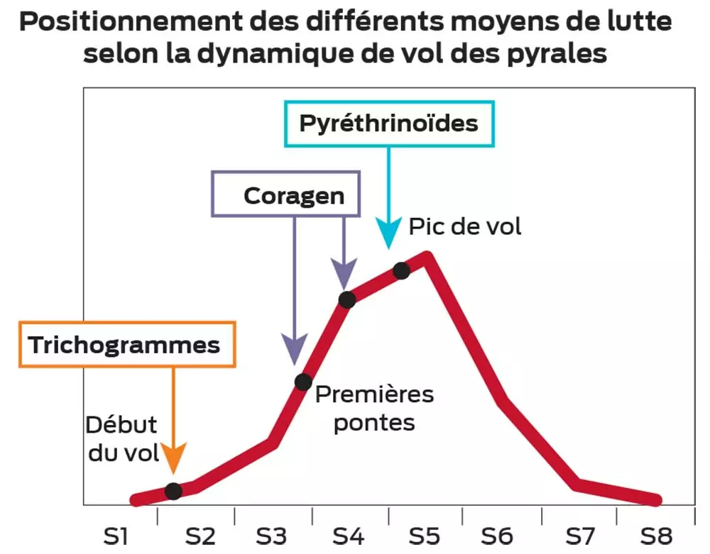 Pour bien gérer le ravageur, les différents moyens de lutte efficaces à disposition nécessitent d’être bien positionnés par rapport au cycle de la pyrale fonction de leurs modes d’action :