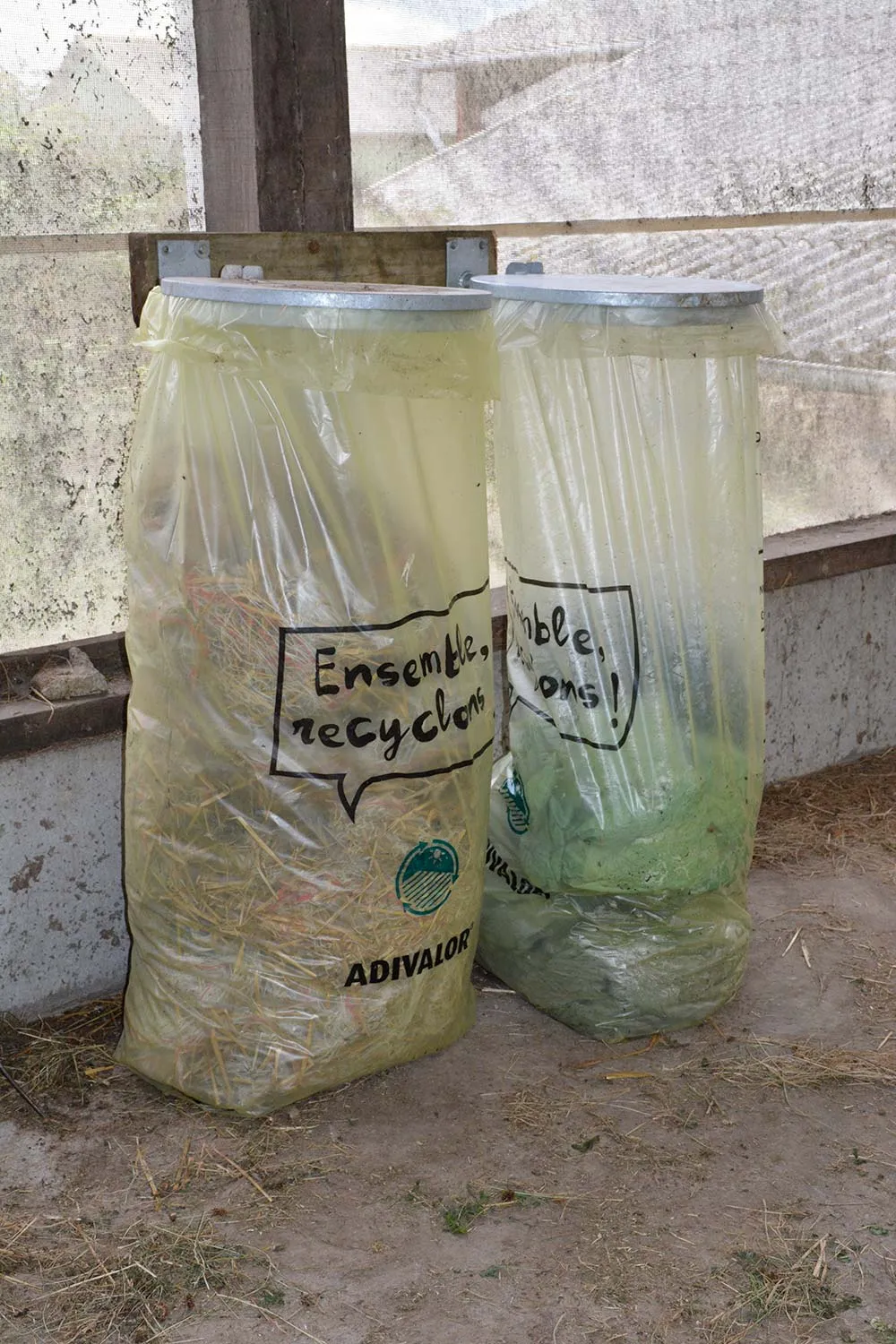Des porte-sacs positionnés dans l’élevage (nurserie et stabulation) permettent de récupérer filets et ficelles.[/caption]