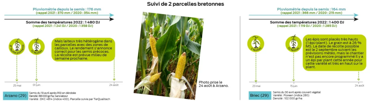 La saison 2022, chaude et sèche, oblige à avancer la récolte. Semé fin avril dans des parcelles riches en matière organique et profondes, le maïs a un bon développement. « Nous semons trois variétés, dont une nouvelle, tous les ans. Nous pesons les épis pour les comparer. Ces essais (d’une nouvelle variété) nous permettent d’anticiper au cas où une ancienne ne serait plus disponible ». La qualité, sans doute un peu moindre que ces dernières années (année 2021 exceptionnelle), n’inquiète pas les éleveurs : « Nous avons du maïs grain humide (boudins) en stock. Il servira à compléter la ration en énergie, en fonction des besoins ». La production laitière ne souffrira pas trop de l’année climatique atypique même si le stock d’herbe enrubannée est moindre que celui de l’année dernière.