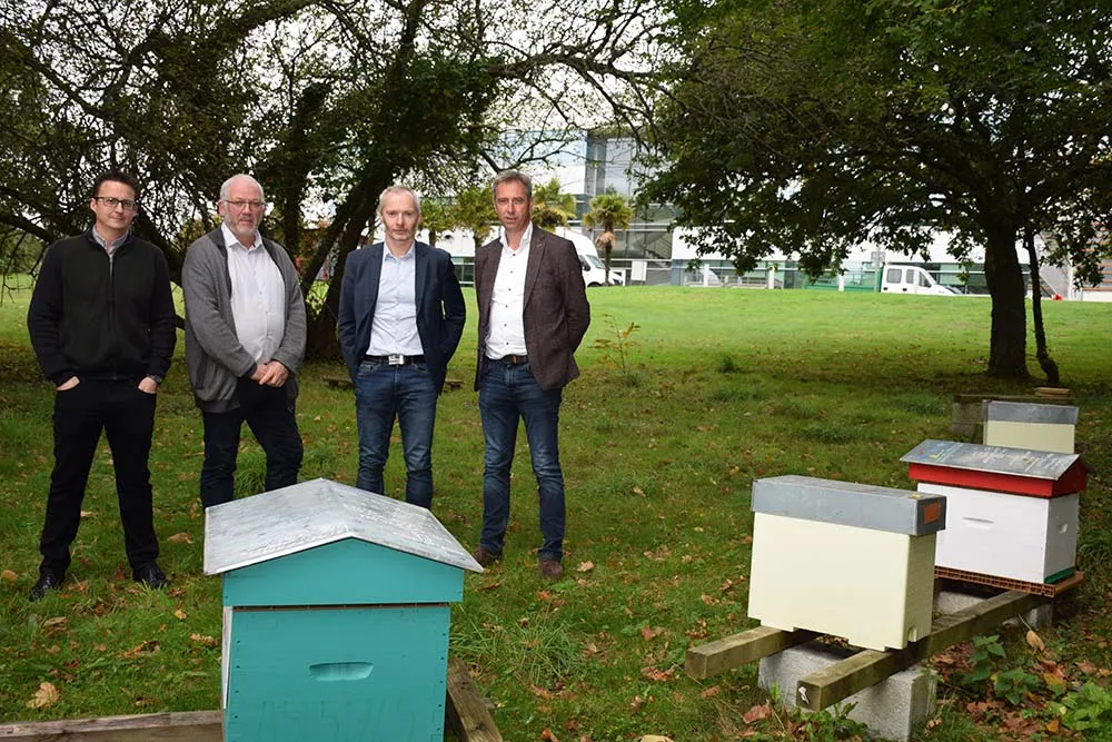 Gilbert Morizur, trésorier de l’Union nationale de l’apiculture française et président de l’Abeille finistérienne, structures organisatrices du congrès européen de l’apiculture, aux cotés de Stéphane Métivier et Gwénaël Hénaff, respectivement président et vice-président de l’association Ruskenn Ruz, et de Daniel Caugant, responsable du marché de l’agriculture au Crédit Mutuel de Bretagne.