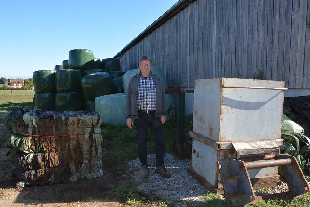 « Tous ces plastiques ne sont pas des déchets. C’est à nous de les collecter proprement pour les recycler », leur attribuer une seconde vie… Et ce « ménage », via un rangement au quotidien, outre l’action des agriculteurs dans le recyclage du plastique qui peut être réutilisé à l’infini, « sert aussi de première étape à la dératisation de nos élevages… », ajoute Jean-Guy Saillard. Les films plastique d’enrubannage sont empilés régulièrement dans un ancien cubi de 1 000 L à armature métallique qui a trouvé une seconde mission. « Mais 4 palettes feraient aussi bien l’affaire ! », mentionne l’éleveur. Des ficelles sont tout d’abord installées, puis les bâches rangées par petits cubes. Quand le récipient est plein, avec un pilon, les agriculteurs viennent tasser le tout, formant un ballot de 300 kg environ. Un couvercle permet de conserver ce plastique au sec. « Pour une manipulation facilitée sur les lieux de collecte et de recyclage, nous conseillons de ne pas dépasser 200 kg pour ces ballots compressés », ajoute Aubert Baumard, conseiller collecte Adivalor Grand Ouest. Avant de préciser : « Mais surtout, il ne faut pas mélanger différents types de matière, chaque plastique ayant sa propre filière de recyclage. »