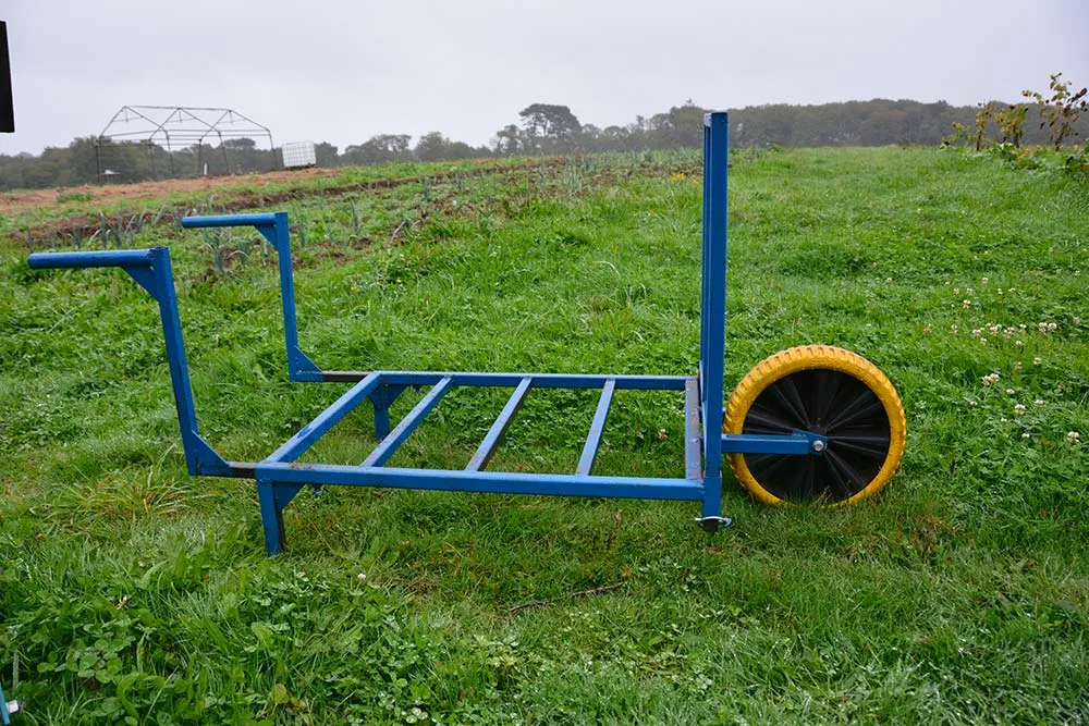 Une fois l’équipement adéquat fabriqué pour lancer son activité, un labour sur la prairie a été réalisé par une entreprise de travaux agricoles locale, suivi d’un passage d’outil à dents. Avant plantation, la campagnole légère, sorte de grelinette améliorée, structure la terre : les dents se plantent dans le sol, puis en se croisant par un mouvement de balancier cassent les mottes. « La campagnole décompacte le sol sur une largeur de 80 cm, soit la largeur d’une planche ». La houe de fabrication maison sert pour le désherbage, la brouette autoconstruite s’adapte aux divers travaux. « Elle me sert aussi bien pour la plantation que pour la récolte ». Modulable, la brouette peut être modifiée avec ses bords amovibles. Les bras peuvent également être allongés pour s’adapter à la morphologie de l’utilisateur.
