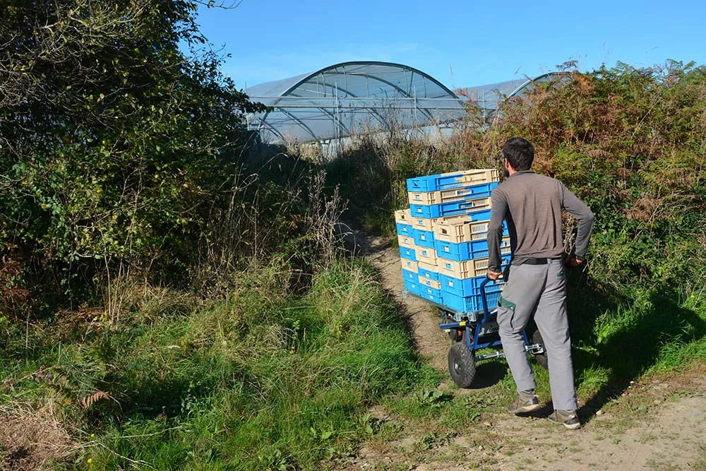 La brouette électrique et le noueur à manche sont deux outils qui facilitent la vie de Charlotte Tisserand et de Victor Bouvard, maraîchers dans le Finistère. Ils se sont fait accompagner et conseiller par la MSA pour gagner en ergonomie et en confort de travail.