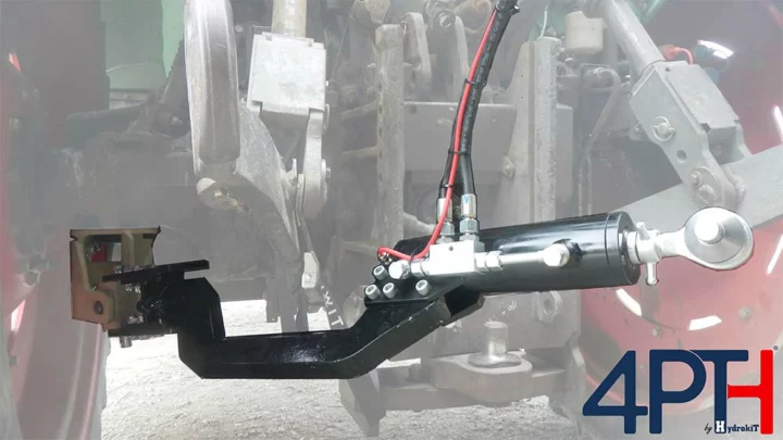 Le système 4PTH permet un déplacement latéral de l’outil sans avoir de jeu dans les axes et de porte-à-faux supplémentaire. Le kit comprend une ferrure à installer sur la trompette du tracteur et une deuxième sur l’outil. Ces deux ferrures sont liées par une barre équipée d’un vérin. Lors d’une contrainte mécanique sur ce vérin, l’ensemble du système déplace l’outil latéralement.