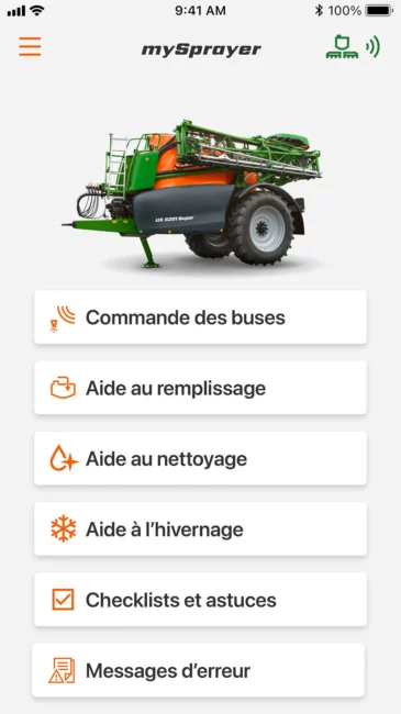 L’application MySprayer se connecte en Bluetooth avec les pulvérisateurs, même ceux n’offrant pas beaucoup d’automatismes. Elle permet alors de bénéficier de fonctionnalités supplémentaires comme les alarmes de remplissage, le calcul des quantités ou le pilotage à distance des buses.