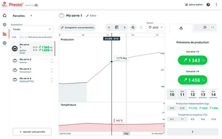 Presto est le premier service de prévision hebdomadaire automatisée des blocs de production à destination des maraîchers. Il permet notamment de mieux négocier ses ventes, de valoriser sa production ou encore de réduire les pertes associées aux écarts de prévisions.