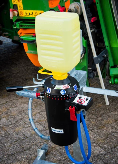 Lors de l’opération de mélange et de chargement du pulvérisateur, le système de transfert fermé (STF) permet la vidange et le rinçage des bidons sans qu’il n’y ait de contact avec l’opérateur. L’outil est composé de deux éléments : un connecteur spécifique développé par plusieurs fabricants et un bouchon unique et normé (ISO 21191). Les premiers bidons équipés feront leur apparition en France en 2023.