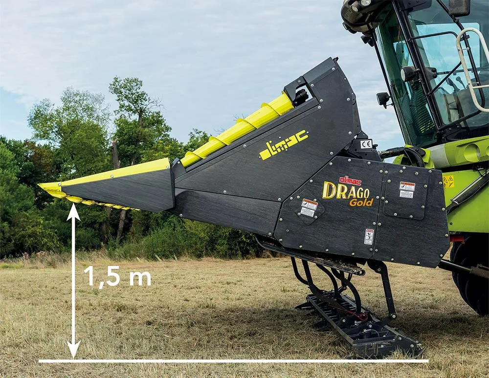 Le cueilleur à tournesol Drago Gold est équipé d’un broyeur hydraulique combinant le broyage au ras du sol et la récolte de la culture jusqu’à 1,5 m de haut. Seul le capitule est récolté, ce qui limite la surcharge de la batteuse.