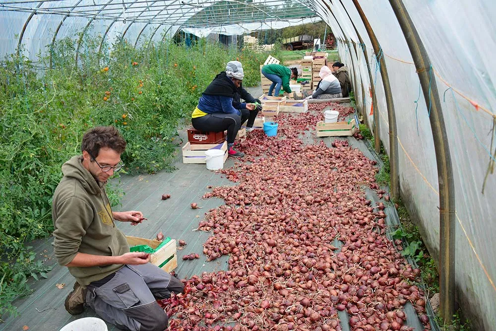 En cette matinée de septembre, une dizaine de demandeurs d’emploi, de tous âges et de divers horizons, trient les oignons sous l’un des tunnels de la ferme Rebom, près du bourg de Sarzeau. Ils viennent de Vannes ou de la presqu’île de Rhuys, souvent en bus, parfois en voiture. Orientés par Pôle emploi ou par des assistants sociaux, ils s’engagent à travailler pendant 6 mois, à raison de 24 heures par semaine, sur le chantier d’insertion de maraîchage biologique. Ils participent à l’ensemble des travaux de production, livrent les légumes aux clients, vendent sur le marché de Sarzeau ou, directement, sur le site de production.