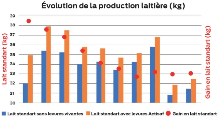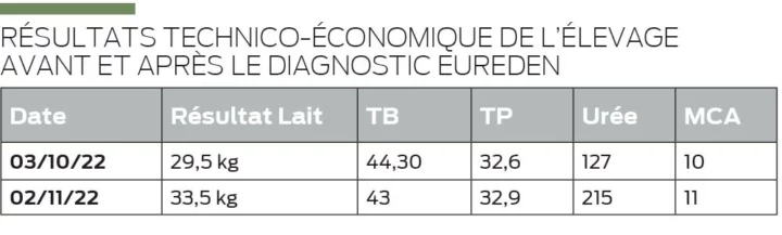 Eureden a fait un essai dans 10 élevages bretons sur 1 000 vaches d’octobre à mars 2022.Le gain moyen en lait a été de +1,6 kg (+1,45 kg pour les élevages produisant entre 30 et35 kg et +1,97 kg pour les élevages produisant plus de 35 kg) et une incidence sur la MCA de +0,54 €/VL/J.