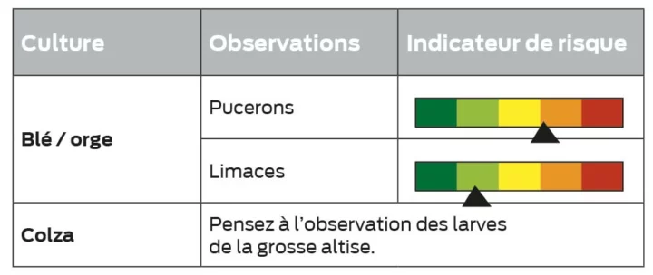 Dans les parcelles du réseau BSV, la présence des pucerons a très légèrement augmenté. Mais au global la situation est stable depuis la semaine dernière. Dans les prochains jours, les conditions climatiques seront toujours idéales à l’activité des pucerons (températures >3 °C). Le risque global reste moyen. La surveillance doit être maintenue, tant que les conditions climatiques restent favorables, notamment dans les parcelles qui n’ont pas dépassé le stade 3 feuilles-début tallage.