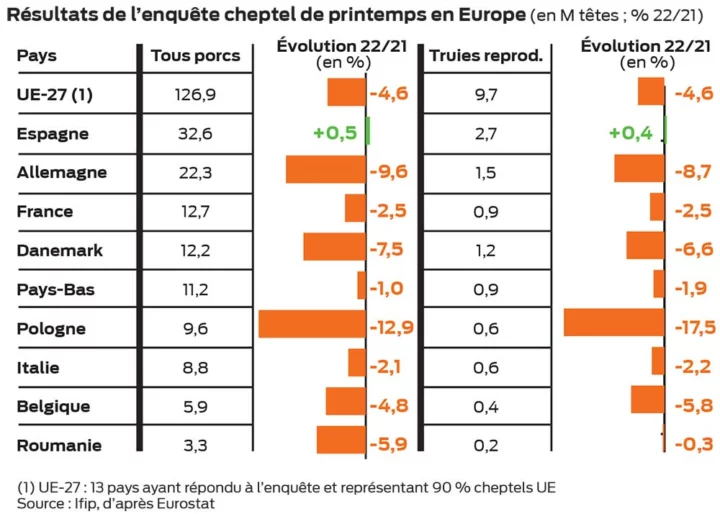 Près de 5 % de truies en moins lors du recensement de mai dernier, soit 500 000 truies. L’offre européenne va diminuer en 2023. Les effectifs polonais mais aussi allemand et danois baissent significativement. « L’augmentation de la productivité ne compensera pas la baisse de cheptel reproducteur », assure Élisa Husson, économiste à l’Ifip. La France résiste mieux grâce au soutien de l’État, au logo « Le porc français » et à moindre dépendance au grand export. Le solde commercial se dégrade en valeur car l’importation de produits transformés, à forte valeur ajoutée, augmente, en provenance d’Espagne mais aussi d’Italie et d’Allemagne (ces deux pays, affectés par la PPA, se tournent vers la France pour écouler leur production indésirable sur leurs marchés export habituels).
