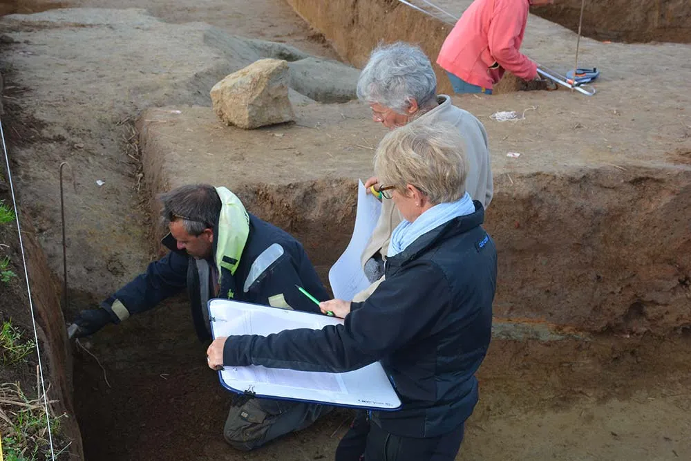 Aidés par les carnets de notes très précises du préhistorien bigouden, les archéologues sont revenus à l’endroit même où Paul du Chatellier avait manié de la pelle un siècle plus tôt. Là aussi où, il y a 4 000 ans, des hommes munis d’omoplate de bœuf avaient terrassé cette même terre pour enterrer leurs morts. « Le tumulus de Saint-Bélec est un édifice important. Sa structure avec des coffres mégalithiques constitués de grosses pierres, qui sont parfois taillées pour s’emboîter entre elles, est caractéristique de l’art funéraire breton même si l’on retrouve des similarités dans le sud-est de l’Angleterre et en Écosse », note Yvan Pailler sous l’œil intéressé de Denise Mévellec, ancienne agricultrice et propriétaire du champ. « Quand on m’a demandé l’autorisation de procéder à des fouilles j’ai été immédiatement d’accord », dit-elle en fidèle témoin des recherches effectuées cet automne. « Je viens tous les jours suivre le chantier. En partageant leurs découvertes sur-le-champ, les archéologues nous font voyager dans le temps ».