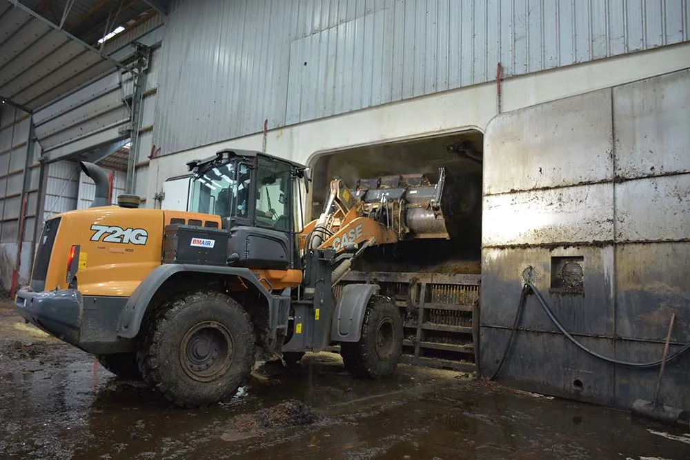 L’unité par voie sèche est composée de 4 tunnels construits sous un grand hangar de stockage. Chaque tunnel béton reçoit 450 m3 de matière. Une fois le mélange chargé, une barrière de protection est installée pour protéger la porte, puis celle-ci est fermée. Un joint d’étanchéité est ensuite gonflé pour que le tunnel soit bien étanche. « Le mélange dans le tunnel est alors aspergé avec du percolat. C’est lui qui contient les bactéries qui vont permettre de lancer le process de méthanisation. Le percolat est stocké dans un digesteur de 900 m3 qui est chauffé grâce à la chaleur récupérée au niveau du moteur de cogénération. Nous travaillons en circuit fermé avec ce percolat à 42 °C qui vient asperger les 4 tunnels toutes les 6 minutes pour obtenir un mélange à 38 °C de température constante. Nous incorporons environ 30 m3 de matière liquide (lisier ou eau pluviale) chaque semaine dans le digesteur pour compenser la déperdition liée à l’aspersion des 4 tunnels », décrit Benoît Riou. Le stockage de la production de biogaz des 4 tunnels se fait dans le digesteur avant de rejoindre le poste de traitement puis le moteur de cogénération. Le prochain projet est d’utiliser une partie de la chaleur venant de la cogénération pour sécher le compost avant sa commercialisation.