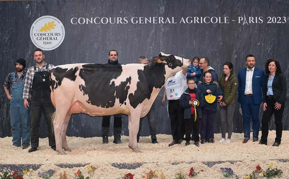 Suivaient alors les cinq classes de vaches adultes. Un défilé impressionnant où le niveau s’élevait au fil des heures. Si la Bretagne a vu passer son heure, un vent de Sud-Ouest s’est alors levé. En 9e lactation, la doyenne Ducasse Fun (Boldwin x Mtoto), à l’EARL de Banos (40), emporte la section des vaches en 7e lactation et plus et le prix de Meilleure laitière. Surtout Ducasse Jaka (Bradnick x Windbrook) du même élevage éclabousse l’arène parisienne de toute sa classe s’emparant du championnat Adulte puis du titre suprême de Grande championne. Jusqu’au verdict final, elle est talonnée par sa dauphine de section Nova Ifty (Fever Crac x Terrason) désignée Réserve de grande championne. Thomas Saunier ne boude pas son plaisir : « Ces deux vaches sont issues d’une section hors-norme de 6e lactation en termes de qualités morphologiques et de capacité laitière. C’est ce que je recherche aujourd’hui, l’animal qui sait produire et qui sait vieillir. » La Landaise Jaka peut monter sur le podium, auréolée de son sacre. Une consécration pour la famille Ducasse, sélectionneurs reconnus depuis des décennies dans le Sud-Ouest, rapidement rejointe par une foule de proches pour partager leur émotion. « Avec ce dos terriblement tendu, ces côtes ouvertes, cette finesse d’ossature, Jaka dégage une telle prestance sur le ring. Il faut simplement admirer ce niveau de longévité, cet état de conservation. En 6e veau, elle renvoie une certaine jeunesse et surtout déborde de modernité. »