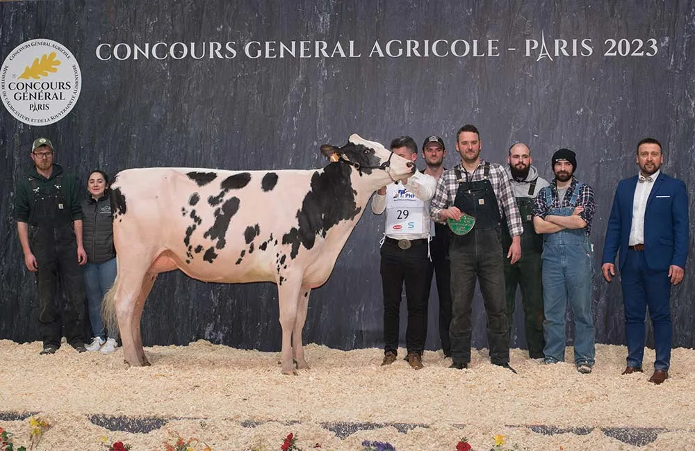 Lundi 27 février, 115 Prim’Holstein sont au rendez-vous de la Porte de Versailles. Au centre du ring, un amoureux des vaches, Thomas Saunier, éleveur en Meurthe-et-Moselle. Comme toujours, la journée démarre par le concours des Rouges. La 3e lactation Night Red de la Liègue (Light Red x Olympian), appartenant à la copropriété EARL Lepoint et SCEA de la Gare (59) se taille la part du lion : prix de section, Meilleure mamelle et Championnat. « Parmi les Rouges aujourd’hui, cette championne est évidente. Très bien construite, dotée d’un squelette exceptionnel, elle se déplace sur d’excellents membres en associant beaucoup de caractère laitier et de modernité », tranche le juge.