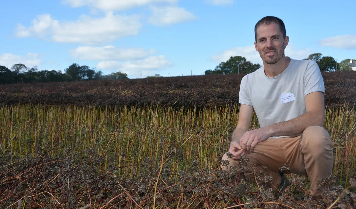 Simon Letourneux, dans une parcelle en cours de récolte. La culture a été fauchée et andainée une semaine avant.
