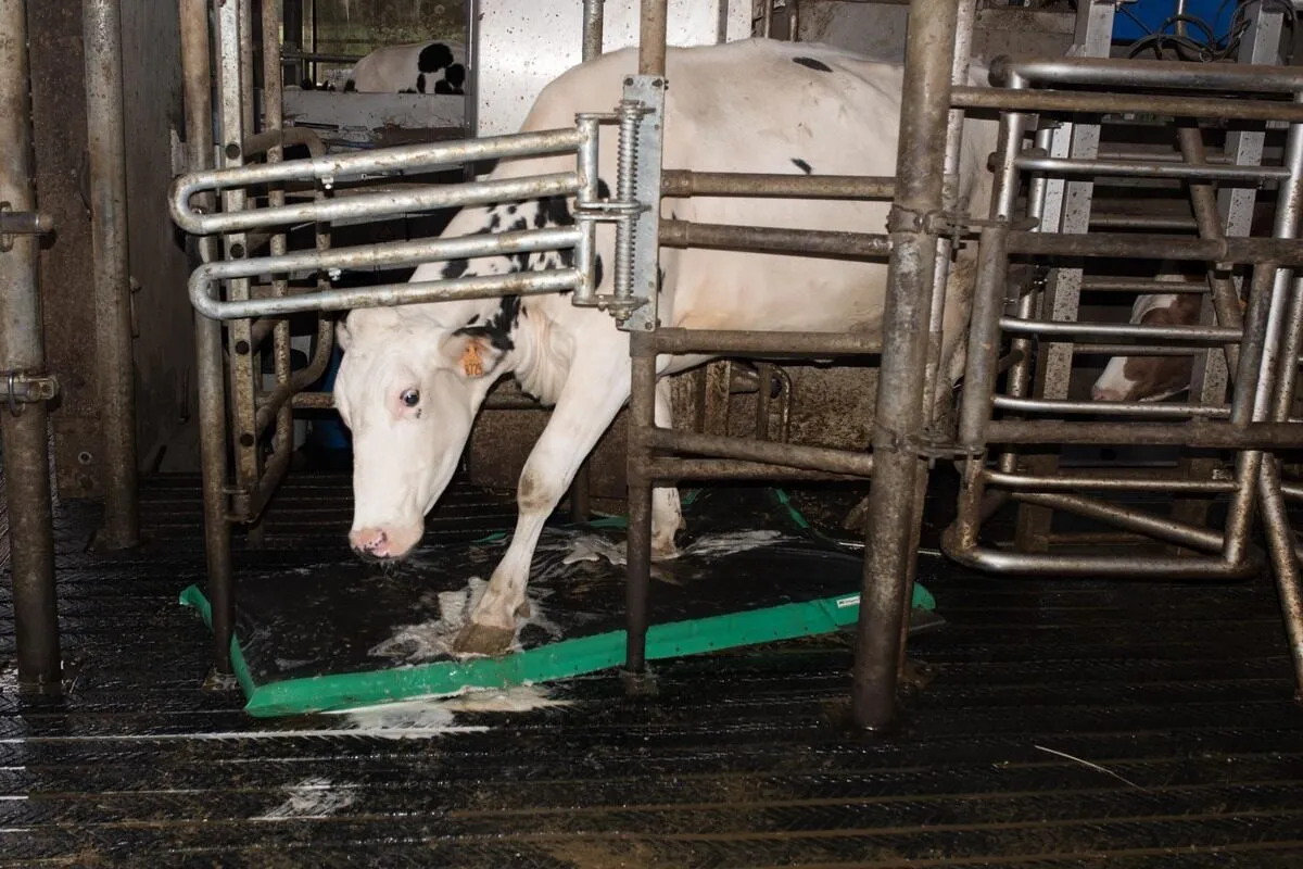 En sortant du robot, la vache marche sur le tapis qui diffuse une mousse désinfectante.