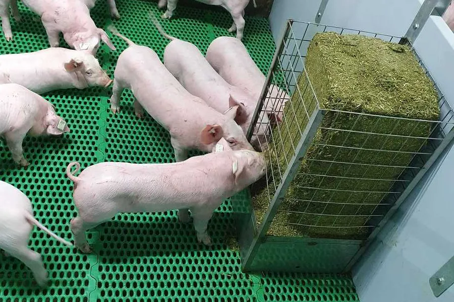 La technique vient de la volaille et de la problématique du picage. Transposée à l’élevage porcin, elle permet de limiter les morsures de queue. « Nous avons réalisé des essais en post-sevrage », indique Noémie Ory, chargée du bien-être animal à la Cooperl. « Utilisé en curatif, dès les premières lésions, le système fonctionne plutôt bien. Il semble difficile de l’utiliser en préventif en raison du coût du râtelier (300 € environ). Mais, c’est bien d’en avoir dans l’élevage au cas où… ». La luzerne déshydratée est déstructurée pour avoir des brins très courts (1 cm) et éviter les problèmes d’évacuation des lisiers. « La compression de la balle est telle qu’elle ne se délite pas. La consommation se fait par le bas ; un petit rebord évite que le fourrage ne tombe dans la fosse. La balle, de 20 kg, est consommée lentement ; elle dure toute la période de PS pour une vingtaine de porcelets ». Le coût de la balle est de 8 €. La consommation de luzerne, estimée à 20-25 g/jour, n’a pas d’incidence sur le GMQ. Dans le cas d’élevage de porcs, surtout queue entière, elle semble bien indiquée, au moins pour la période de PS. En test à l’Ifip L’Ifip a également testé la balle de luzerne, dans son râtelier spécifique, en comparaison avec un disque à mordiller ou des chaînes, dans des cases de porcelets en PS avec ou sans queues longues. « La balle de luzerne a été plus attractive que les autres types d’enrichissement du milieu et semble avoir limité l’apparition de caudophagie dans les cases », indique Alexandre Poissonnet, en charge de l’essai. « Ce système pourrait donc être un moyen efficace pour prévenir et interrompre des épisodes de morsures ». Dans cet essai, les épisodes étaient trop peu nombreux pour tirer des conclusions définitives, mais il va dans le sens des observations de la Cooperl….