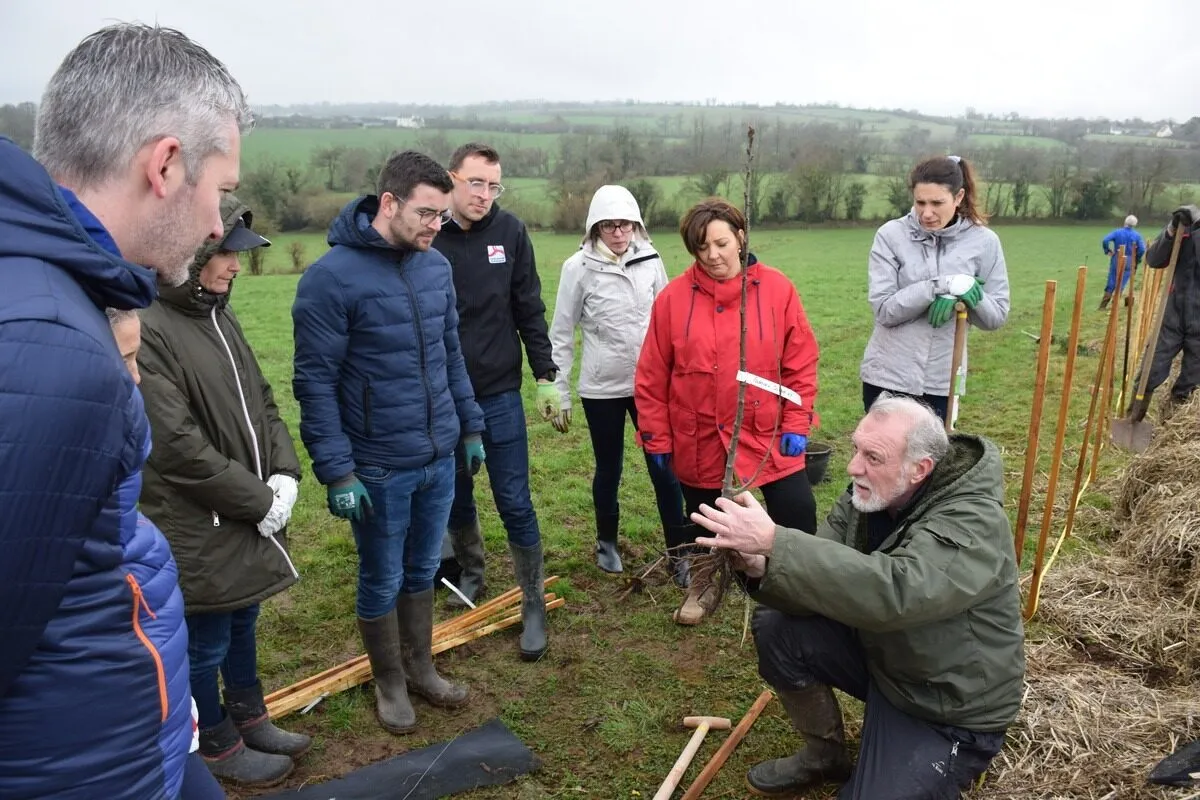 C’est une après-midi de fin d’hiver où règne un temps doux et calme. La bruine est si légère qu’elle paraît flotter dans les airs. « Les conditions sont idéales pour effectuer des plantations », soulignent Ludovic Jézéquel et Jean-Max Le Filleul, les deux conseillers de la Chambre d’agriculture qui encadrent l’opération. Enfilant bottes et gants, une dizaine de volontaires se préparent pour une séance de mise au vert d’un genre particulier. En temps normal, Gaëlle dirige la Caisse du Crédit Mutuel de Bretagne à Carhaix. Fabien, lui, est à la tête du Pôle d’expertise carhaisien, Ariane, Franck et Arnaud sont, eux, responsables de clientèle agricole. Anne-Gaëlle, Sabrina et Sandrine, chargées de la clientèle des professionnels. Et Pierre-Yves, conseiller en gestion de patrimoine… Tous ces spécialistes du monde bancaire ont répondu à l’invitation de François L’Haridon, président de la Caisse CMB de Pleyben et de la section finistérienne de la Caisse de Bretagne de Crédit Mutuel Agricole. Pour une mission exceptionnelle : planter 250 mètres de haie !
