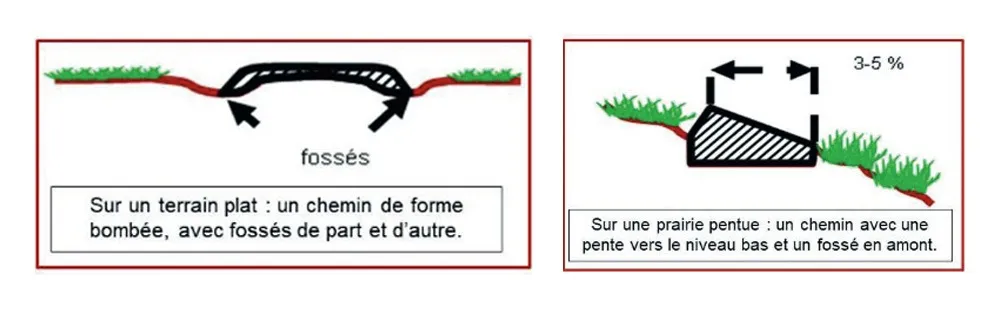 De bons chemins, c’est la garantie d’une meilleure efficacité au pâturage. Avant votre chantier, identifiez l’usage du chemin (passage d’engin ou non, taille du troupeau, proximité du siège) pour définir la largeur et les matériaux nécessaires. L’eau est le premier ennemi des chemins, positionnez-les de sorte à ce qu’ils se ressuient et sèchent rapidement : sur sol portant, au sud des haies ou talus, en surélévation, de forme bombée ou en pente avec un fossé. Le coût pour stabiliser des chemins peut varier de 5 à
