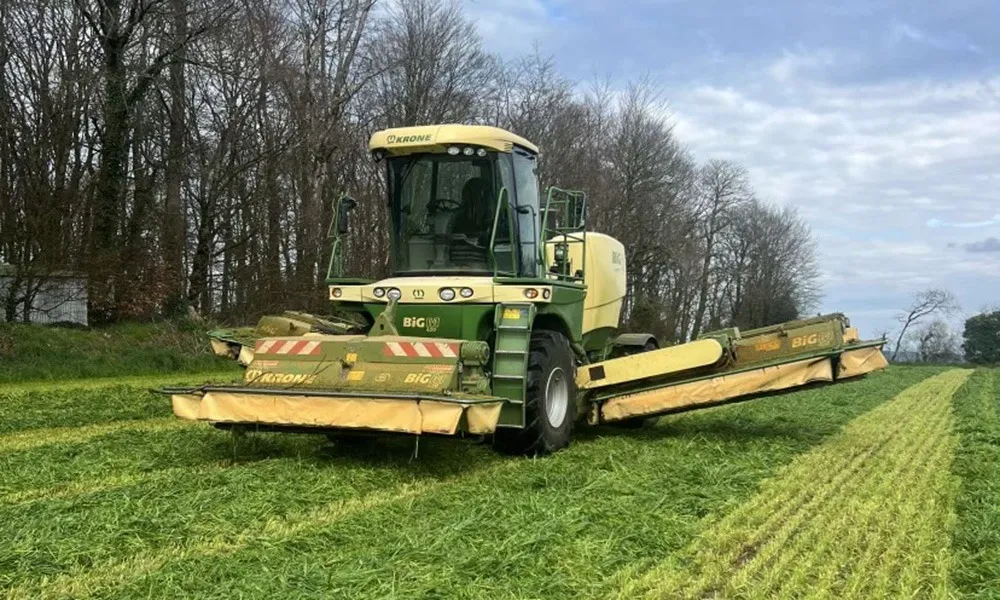 « Avec l’agrandissement des troupeaux laitiers depuis 7 à 8 ans, nous avons des surfaces en herbe qui se développent. Les éleveurs mettent de l’herbe en dérobée comme couvert végétal pour pouvoir la valoriser au printemps », constate Xavier Briand, entrepreneur de travaux agricoles sur Caouënnec-Lanvézéac (22). Il y a 20 ans, l’ETA avait une seule faucheuse conditionneuse traînée, en 3 mètres de largeur. Cinq ans plus tard, l’entreprise est passée au combiné porté avant et traîné arrière, avec tapis groupeur d’andain. En 2014, l’ETA Briand s’est équipée d’un groupe de fauche de 9 mètres de largeur avec faucheuse avant portée et 2 faucheuses arrière avec tapis groupeur. « Avec cet équipement, on arrivait à des débits de chantier entre 4 et 6 ha/heure. » Avec l’agrandissement des troupeaux, les surfaces en herbe se développent Absorber les pics de travail au printemps Malgré un bon débit de chantier, le groupe de fauche est vite arrivé à saturation car les fenêtres météo sont courtes. « En 2018, j’ai acheté un automoteur de fauche Krone Big M 420. On fauche sur 10 m de large avec un conditionneur et un système à vis pour andainer plutôt que par tapis. Cela permet de préserver les feuilles et le trèfle sur des cultures fragiles. Le débit de chantier est de 6 à 10 ha par heure, ce qui permet d’absorber les pics de travail du printemps lorsque le temps est menaçant », indique Xavier Briand. Avec ce matériel, le client n’a pas besoin d’andainer, tout est fait en un seul passage. L’entrepreneur facture sa prestation à l’heure, il faut compter entre 40 et65 €/ha. Cela dépend bien sûr du parcellaire ou de la quantité d’herbe à faucher : « Cela varie de 6 t/ha à 25 t/ha de matière brute ce qui fait varier la vitesse d’avancement. » 1 500 ha fauchés par an L’automoteur de fauche offre une maniabilité sans…