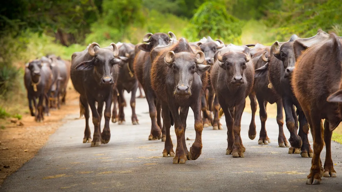 Un troupeau de buffles marche sur une route dans le sud de l'Inde - Illustration Exportation : L’Inde revient à l’international