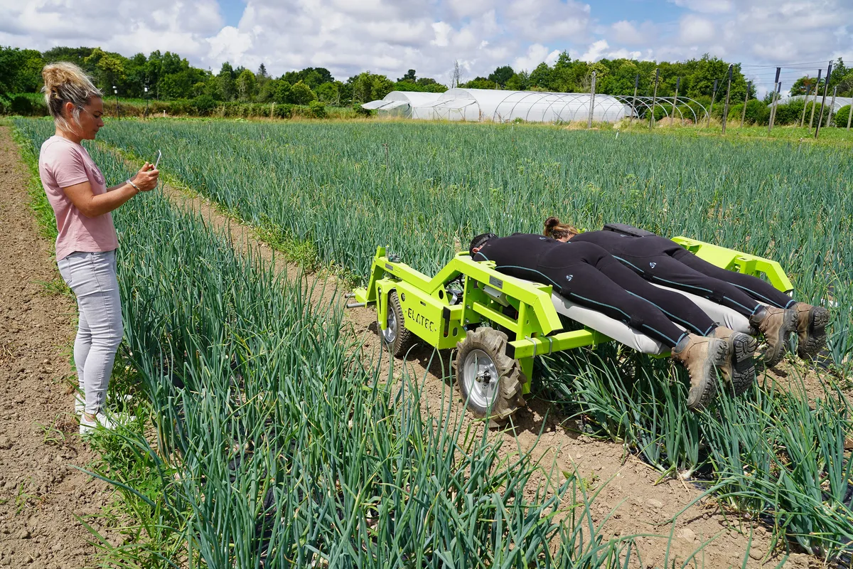 La station d’essais d’Auray s’est équipée de presque toute la gamme existante en termes de cobotique, d’exosquelette, de lit de désherbage… pour tester ces solutions de réduction de la pénibilité du travail. « Plutôt que d’essayer de faire toutes les opérations de la ferme avec un seul outil, nous identifions les opérations culturales les plus pénibles en maraîchage et vérifions quel outil est le plus adapté », explique Maët Le Lan. Chaque outil, dont certains ont un prix d’achat pouvant aller jusqu’à 35 000 €, va donc être utilisé dans les situations les plus appropriées. Sont ainsi décortiquées les postures lors du désherbage de la carotte, de la récolte des courgettes avec le port de charges lourdes, de la récolte des haricots, de la plantation, du désherbage et de l’arrachage en oignon et échalote ainsi que pour la récolte des fraises. Et ce travail de caractérisation des différents outils va plus loin : « Nous amassons un maximum de références technico-économiques pour élaborer des fiches », retour d’expériences « très complémentaires du cahier des charges des fabricants. La pénibilité au travail dépend des antécédents médicaux et du ressenti de chacun. Il faut prendre en compte l’échelle humaine, personnaliser l’organisation, on le fait rarement dans le monde du travail ». Ainsi et en prenant en exemple un lit de désherbage, un opérateur trouvera l’outil très confortable quand un autre, de plus petite taille, ne pourra pas l’utiliser car la solution ne sera pas adaptée à sa morphologie. Par ailleurs, il y a souvent un transfert de pénibilité avec ces outils, « ce que nous gagnons sur les genoux nous pouvons le perdre sur les cervicales ». La station met à disposition des producteurs tous ces retours d’expériences. En cas d’hésitation avant l’achat du matériel, ils peuvent s’ils le veulent venir les essayer sur la station et échanger avec l’équipe.