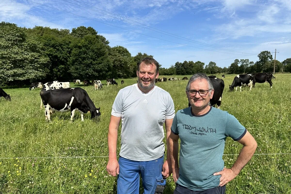 Au Gaec du Landier, Yannick Joubrel et Régis Blot élèvent 75 vaches laitières (croisement 3 voies Prim’ Holstein, Brune des Alpes et Normande). Le troupeau a produit 430 000 litres de lait pendant la dernière campagne. La SAU de 123 ha est majoritairement composée d’herbe (82 ha). « Nous cultivons également du maïs, du blé meunier, de l’orge brassicole, du sarrasin et un mélange triticale et féverole », déclarent les éleveurs. La ferme est en bio depuis 2017.