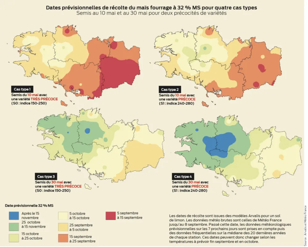 Semis autour du 10 mai : récolte à 32%MS autour du 1 octobre (10 octobre Centre-Bretagne) ;