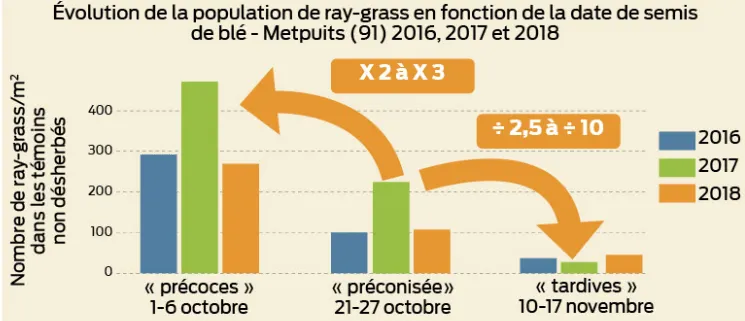 Les essais historiques Arvalis et les observations sur le terrain chaque année mettent en avant de manière unanime l’augmentation de la pression en graminée lorsque l’on précocifie les semis. Une action qui impose en plus un programme double passage d’herbicides (prélevée puis post-levée 1-2 feuilles) à l’automne contre un passage en situations d’infestation moyenne à faible et un risque de perte de rendement en raison de la nuisibilité du ray-grass.