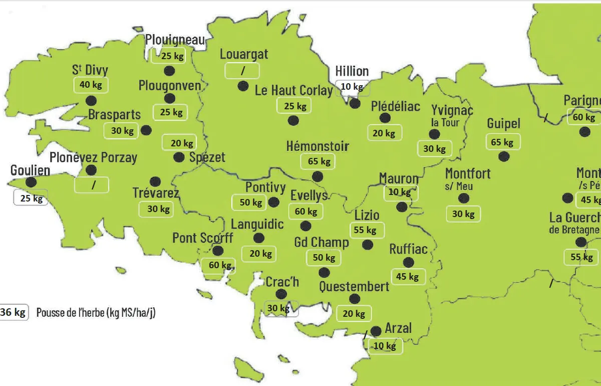 Les pousses de l’herbe mesurées du 23 au 30 septembre varient de 8 à 66 kg de MS/ha/jour avec une moyenne de 36 kg de MS/ha/jour. Le niveau reste haut pour la saison grâce à de très bonnes pousses observées en Ille-et-Vilaine et Morbihan.
