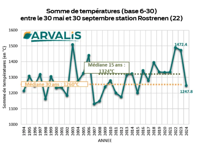 En 2023, les semis étaient également décalés sur la fin mai avec néanmoins une récolte dans les dates calendaires classiques en raison d’excès de températures sur juin et fin août/début septembre permettant de rattraper le retard pris aux semis. Cela n’a pas été le cas en 2024, l’année est anormalement fraîche par rapport aux précédentes (voir graphique) : sur la station de Rostrenen en Centre-Bretagne, on observe une augmentation des températures sur les 15 dernières années de manière linéaire entre le 30 mai et le 30 septembre, mais la campagne 2024 se retrouve anormalement dans la médiane des 30 dernières années au lieu d’être dans la lignée de l’augmentation continue des températures. C’est près de 225 °C d’écart entre 2024 et 2022-2023 soit l’équivalent d’un écart d’une dizaine de points de matière sèche à la même date entre 2024 et 2023 !