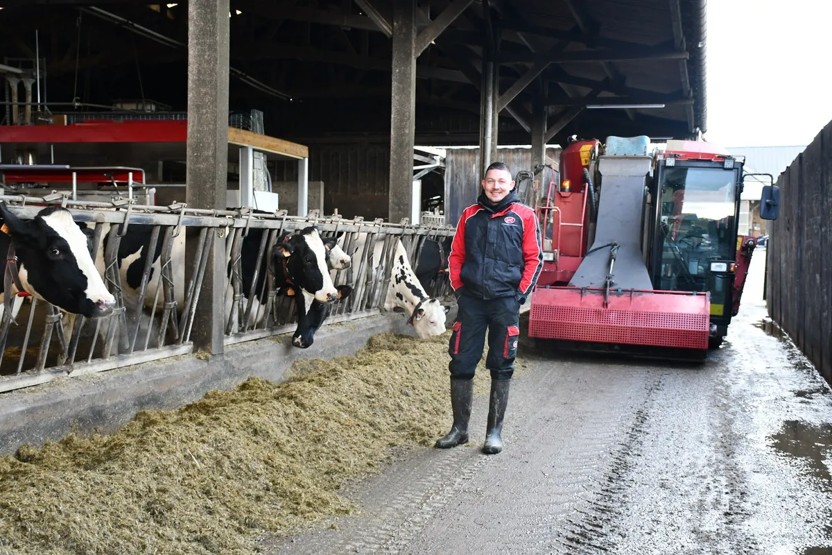 Alexis Robert, 30 ans, s’est installé avec son père Christophe le 1er janvier 2022. Aujourd’hui, le cheptel compte 65 vaches laitières. Pour la distribution de l’alimentation, les associés utilisaient une désileuse portée de 2 m3. Un système simple mais chronophage. « Nous la dételions constamment. Le correcteur devait être ajouté à la pelle », relate Alexis Robert qui regarde de près le critère EBE à l’heure.