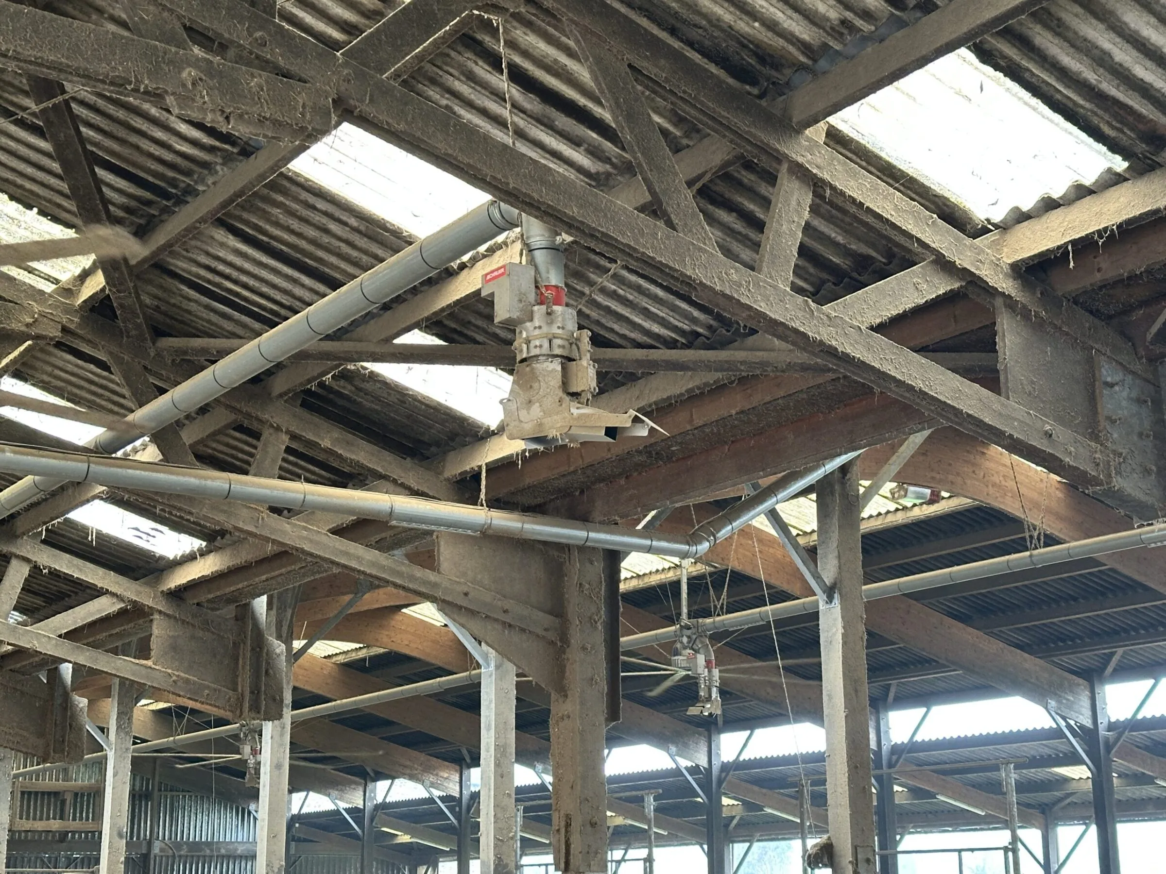 Le système de distribution de la pailleuse Stohmatic repose sur une chaîne à pastille qui pousse la paille dans un tuyau perforé. Par gravité, la paille tombe à travers des répartiteurs qui l’étalent uniformément. « Ce système était parfait pour des logettes mais la zone de couverture n’était plus assez large pour une aire paillée », note Antoine Boixière. En 2024, l’éleveur remplace alors son équipement par le modèle ASD de chez Schauer, pour un montant de 200 000 euros. Désormais, 11 buses rotatives à 360° assurent la projection de la paille cinq fois par jour dans le bâtiment. Trois circuits de distribution desservent respectivement les veaux et les génisses, ainsi que les deux lots de laitières. « Contrairement à la chaîne à pastille, chaque buse est indépendante. Tout est paramétrable et contrôlable depuis mon téléphone. » Une partie de l’ancien système Stohmatic a été conservée pour pailler le bâtiment des taries et des animaux préparés au vêlage. Chaque jour, cinq big ballers sont utilisés à la fois pour le paillage et pour l’alimentation du cheptel.
