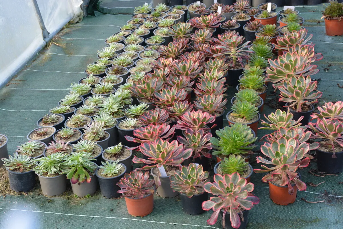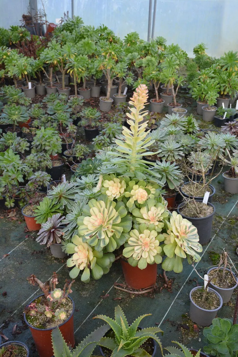 Dans la famille des Crassulacées, je demande un aeonium. Et pour trouver cette carte, nul doute qu’il faut se diriger vers Ploumoguer (29), chez Hubert Debbasch qui collectionne pas moins de 400 variétés de ce ‘chou en arbre’, méconnu mais qui a su conquérir le cœur de ce grand jardinier dans l’âme. Originaire de Provence, c’est en Bretagne qu’il a décidé de s’établir en 2003 avec son mari et c’est là qu’il a démarré des semis de plantes grasses. Il s’est très vite centré sur l’aeonium. Et depuis qu’il s’est installé comme agriculteur sur 6 ha dont 2 500 m2 de serres en 2016, il lui consacre toute sa vie.