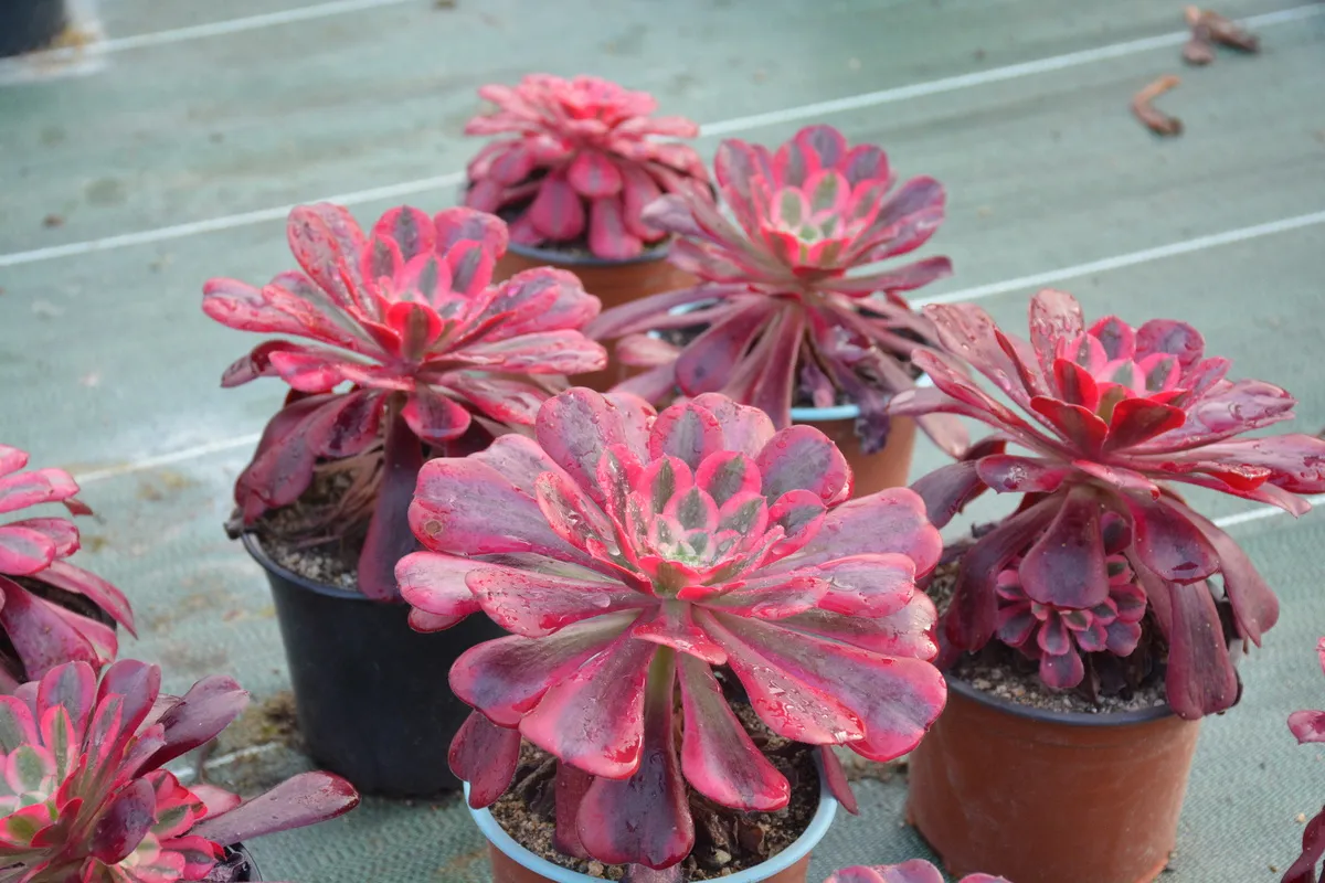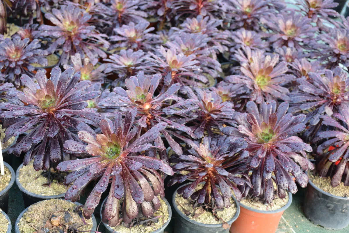 Les aeonium sont faciles à cultiver. On les multiplie par semis ou par bouturage. Le terme grec de ce genre botanique signifie vivace, toujours en vie, éternel… « Plante succulente, elle contient dans ses feuilles des sucs qui lui permettent de résister aux conditions extrêmes… et elle ne craint que le gel . » Ses feuilles persistantes oblongues, ovales ou spatulées, épaisses et charnues, lui « donnent une allure qui présente beaucoup de grâce. C’est une plante à la fois solide et douce de par ses formes et extrêmement graphique, tout en gardant un design géométrique contemporain », décrit le passionné, toujours disert et dithyrambique à l’évocation de ses plantes. Et cela sans compter sur la déclinaison de la palette de couleurs variant du vert clair, pourpre-noir, rouge, orange, bleuté, panaché de crème ou de blanc… qui évolue au fil des saisons. Et si le feuillage fait penser à une fleur toute l’année, les véritables inflorescences, souvent de couleur jaune, poussent à partir du cœur des rosettes.