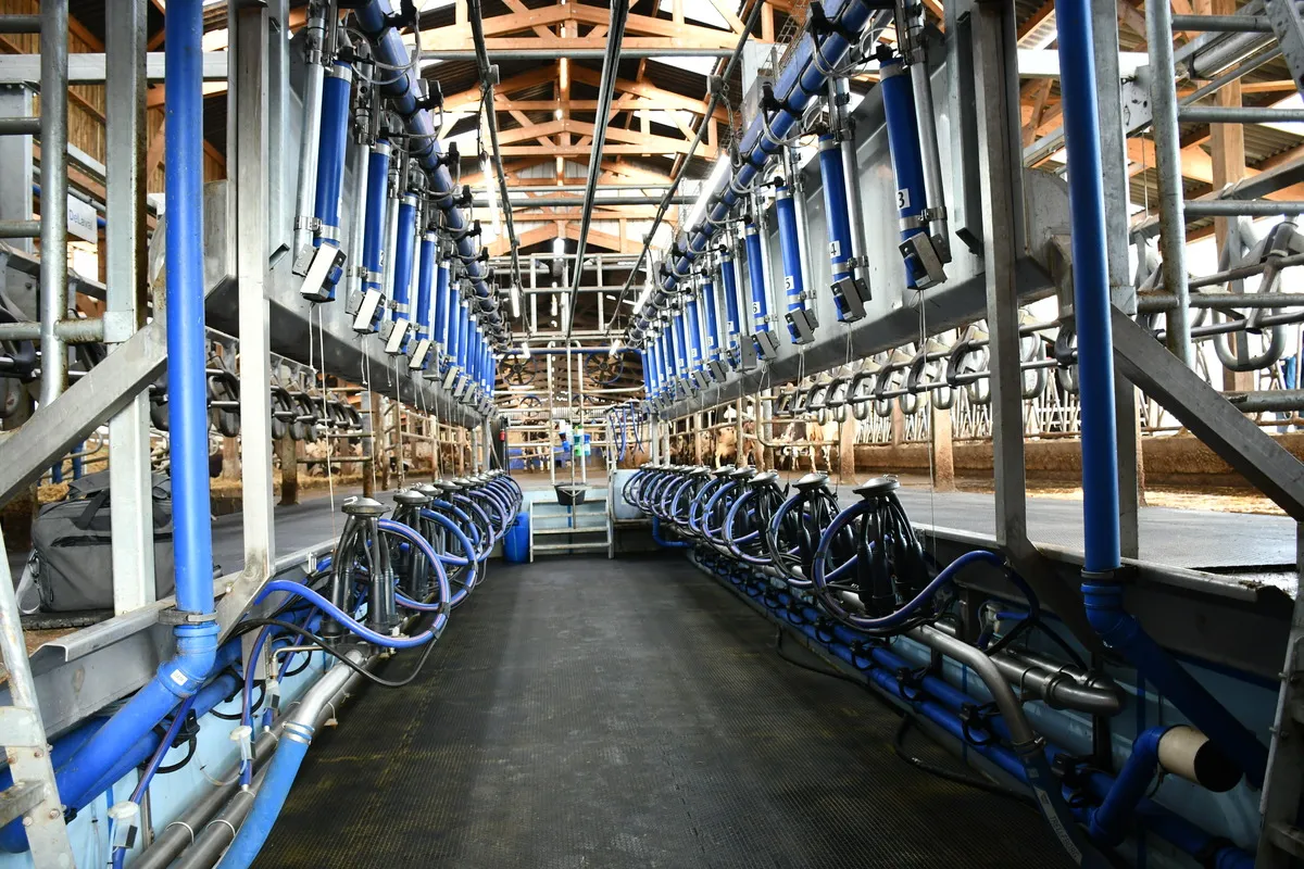 Sur l’exploitation, l’ancienne salle de traite 2 x 5 épi était installée dans un autre bâtiment. Le nouvel équipement 2 x 12 postes a été placé en bout de stabulation, derrière un grand parc d’attente. Désormais, « la traite des 110 vaches nous demande 1 h à une personne plus ½ h pour une 2e personne », notent les associés. Les vaches arrivent les unes derrière les autres dans un couloir qui est fermé par une porte coulissante quand il n’y a plus de place sur le quai de traite. Le pare-bouse vertical, décalé vers la fosse, offre une proximité de la mamelle pour le trayeur. Confortable pour les éleveurs, le sol de la fosse est recouvert d’un tapis constitué de dalles en caoutchouc. La contention avant présente une forme de ‘bouteille de lait’ pour accélérer l’entrée et la sortie des animaux. Les racleurs passent aussi sur les deux espaces de sortie des vaches.