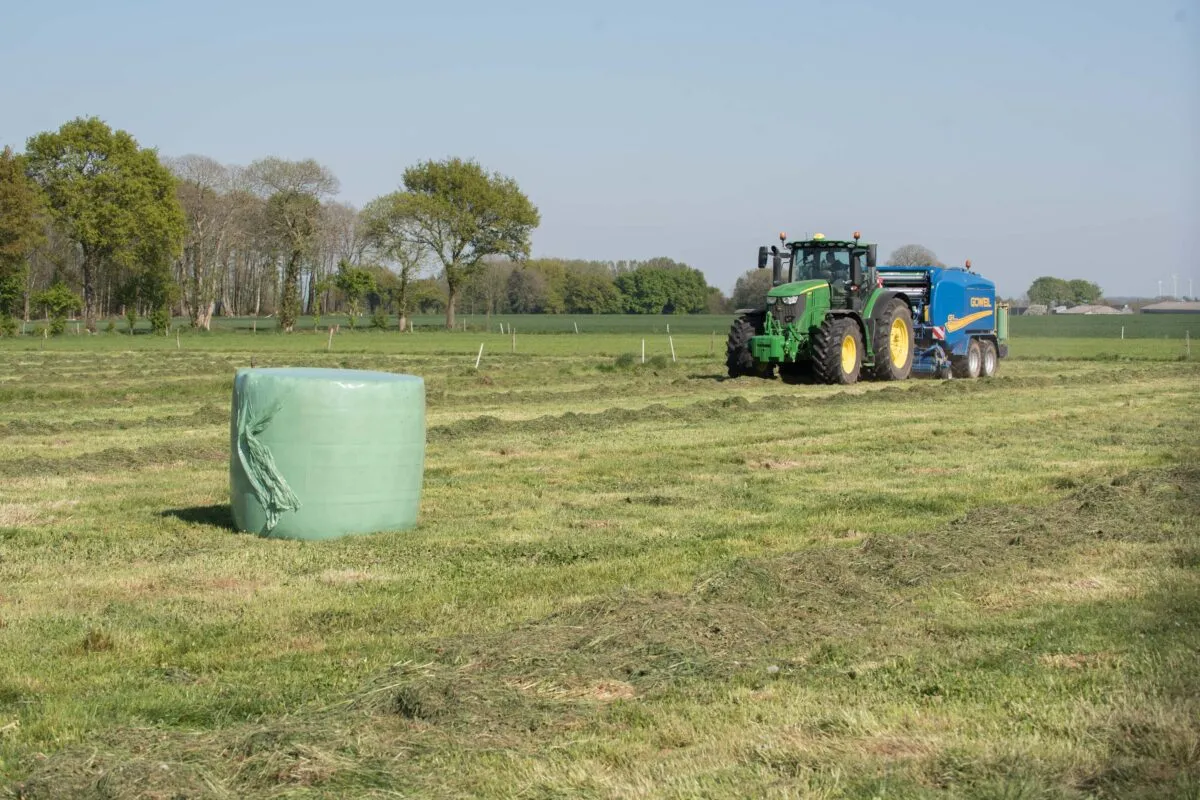 un combiné presse enrubanneuse au travail dans un champ - Illustration Choisir sa presse à fourrage