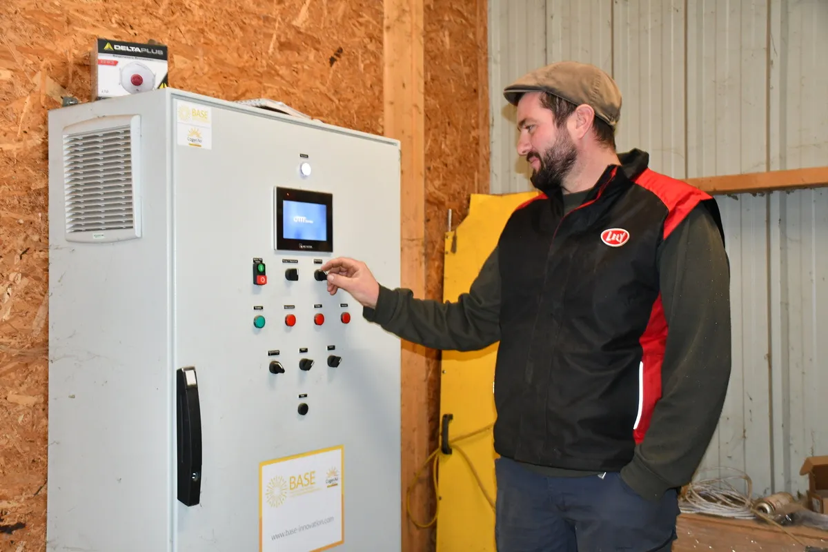 « Les panneaux solaires double face (Cogen’Air) ont chacun une puissance de 265 Wc électrique sur la face extérieure et 744 W thermique de chaleur sur la face intérieure, soit une puissance totale installée de 71 kWc électrique et 201 kWth », chiffre Solène Michenot, développeur projets séchage sur le secteur Ouest Base. Le hangar de 900 m2 et 12 m de haut se compose de 2 cellules de séchage (180 m2 chacune) montées sur des caillebotis à 45 cm du sol, et d’une zone de stockage à plat sur le sol en béton de 260 m2.