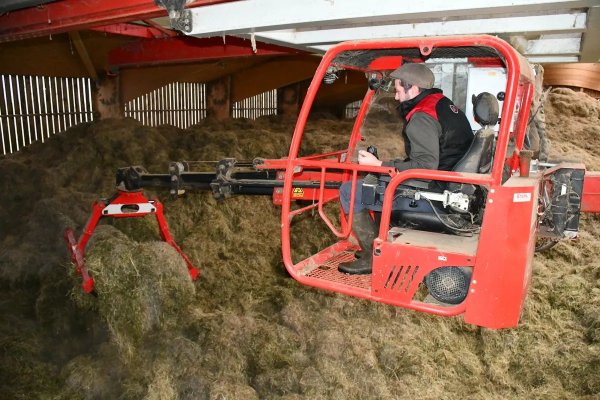 Aujourd’hui, « notre SAU de 136 ha est en herbe avec juste un peu de mélange céréalier (pois, féverole, avoine, triticale) à côté. Les prairies sont constituées principalement de luzerne, trèfle, fétuque et ray-grass », indique Cyril Courcelle. Les prairies sont fauchées avec un andaineur à tapis, puis l’herbe est fanée 1 ou 2 fois et ramassée à l’autochargeuse, outil qui permet aussi la redistribution. La centaine de vaches laitières est traite par 2 robots. La moyenne d’étable atteint 6 500 L avec un TP de 32 et un TB de 41. « En hiver, les vaches ne reçoivent que du foin. Et du méteil aplati est distribué dans les robots.»
