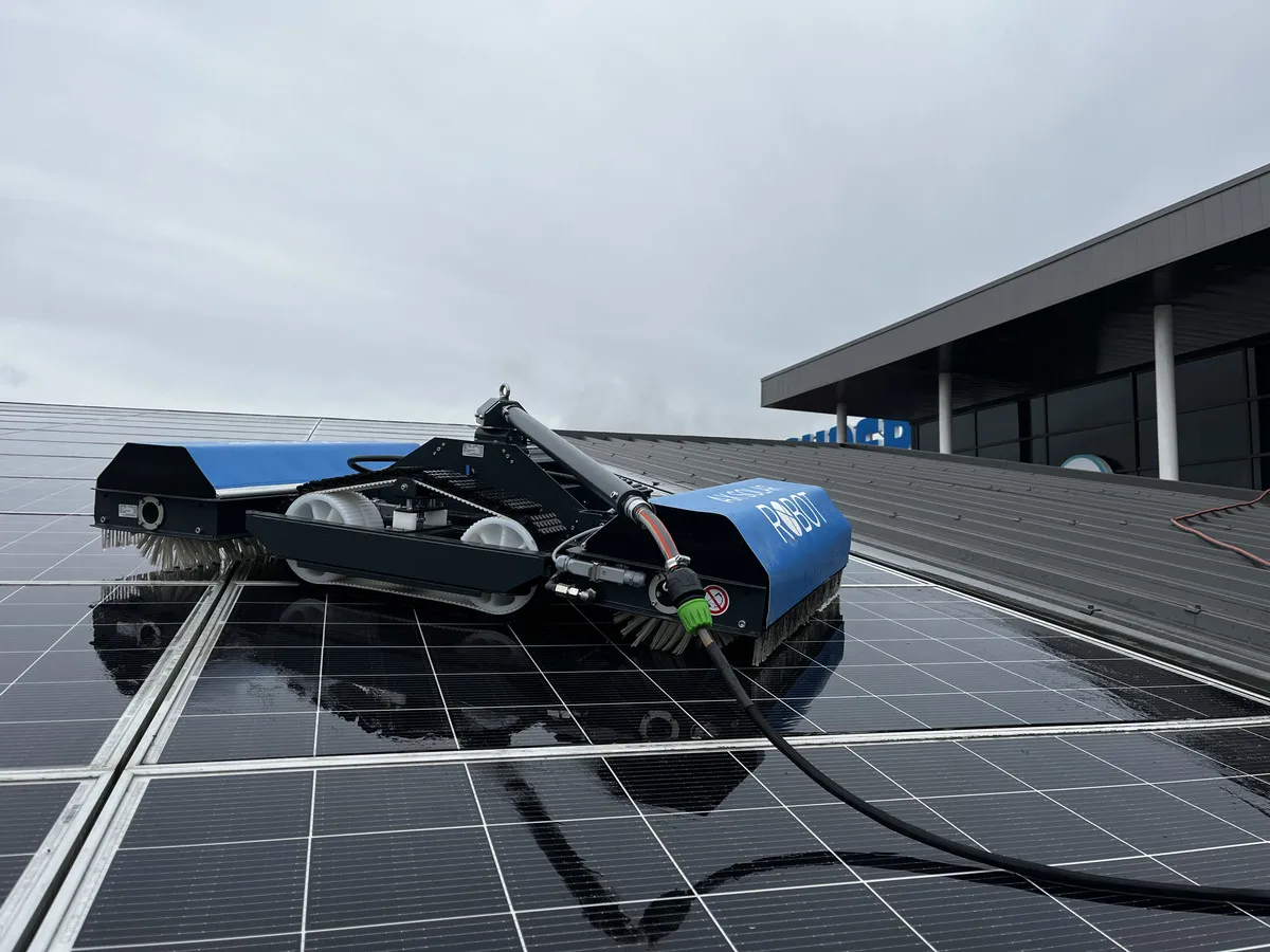 Pour garder tout le potentiel de production d’énergie, Emmanuel Goualan pilote un petit robot qu’il pose sur le toit. L’engin est monté « en brosses souples, pour ne pas détériorer la couche de protection du panneau. Si la brosse est trop agressive, l’installation sera poreuse et retiendra beaucoup plus de saletés ». Ce robot, démontable, va et vient sur l’installation, et peut réaliser son travail sur des pentes accentuées.
